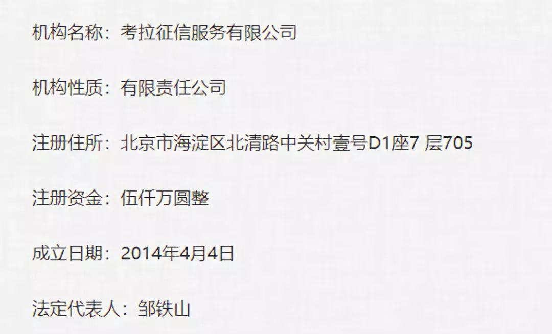 考拉征信官方网站披露信息显示,公司成立于2014年,法定代表人为邹铁山,公司共有高管人员5人,均有10年以上的金融信息、数据统计挖掘等行业从业经验,是公司的骨干与技术力量。董事长戴启军,法人代表、执行董事、经理邹铁山,总裁、首席风险官郑和平,监事黄燚,常务副总裁葛伟平。