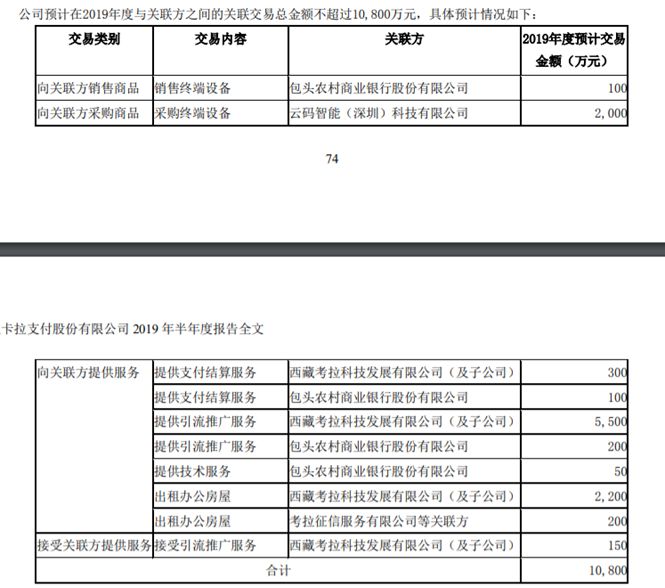 被切断身份证核验接口,“易分期”业务陷入停滞,对拉卡拉真的没有影响吗?拉卡拉2019年半年报显示,拉卡拉与西藏考拉科技发展有限公司之间存在关联交易,拉卡拉预计,2019年通过向西藏考拉提供支付结算服务(300万元)、引流推广服务(5500万元)、出租办公房屋(2200万元)累计金额达8000万元。