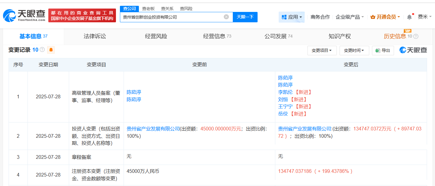 天眼查App显示,近日,贵州省创新创业投资有限公司发生工商变更,注册资本由4.5亿人民币增至约13.5亿人民币,增幅约199%,同时新增多位高管。