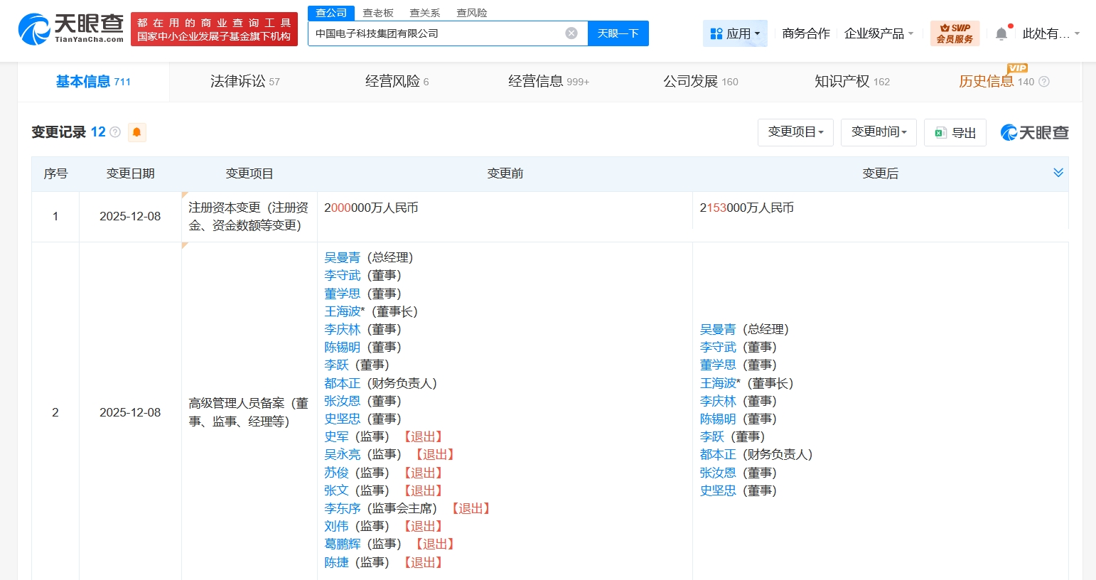 天眼查App显示,近日,中国电子科技集团有限公司发生工商变更,注册资本由200亿人民币增至215.3亿,增幅约7.7%,同时,多位主要人员发生变更。