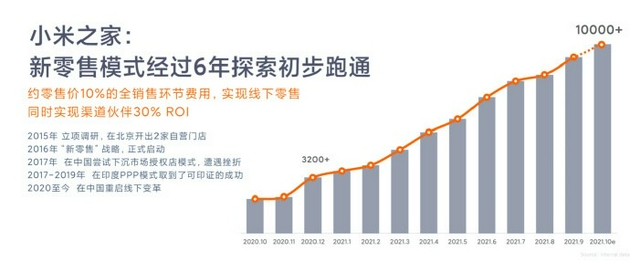 雷军在投资者日上表示,小米之家的新零售模式经过6年探索初步跑通。约零售价10%的全销售环节费用,实现线下零售,同时实现渠道伙伴30% ROI(投资回报率) 。预计今年10月,小米之家的线下门店数也将突破1万家。