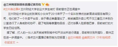 早些时间,一则兰州大学生创业做外卖平台,遭美团公司打砸住院的新闻引发众方关注。据了解,兰州财经大学毕业的张某和小伙伴于2015年开了一个名叫甘肃优创教育咨询服务有限公司,他们做了一个外卖平台后,由于单量增加了,就被美团外卖公司不仅三番五次来到办公室进行了人身威胁和恐吓,砸了电脑等贵重物品后,还对当事人脸部扇巴掌,目前被打的大学生已经住院。
