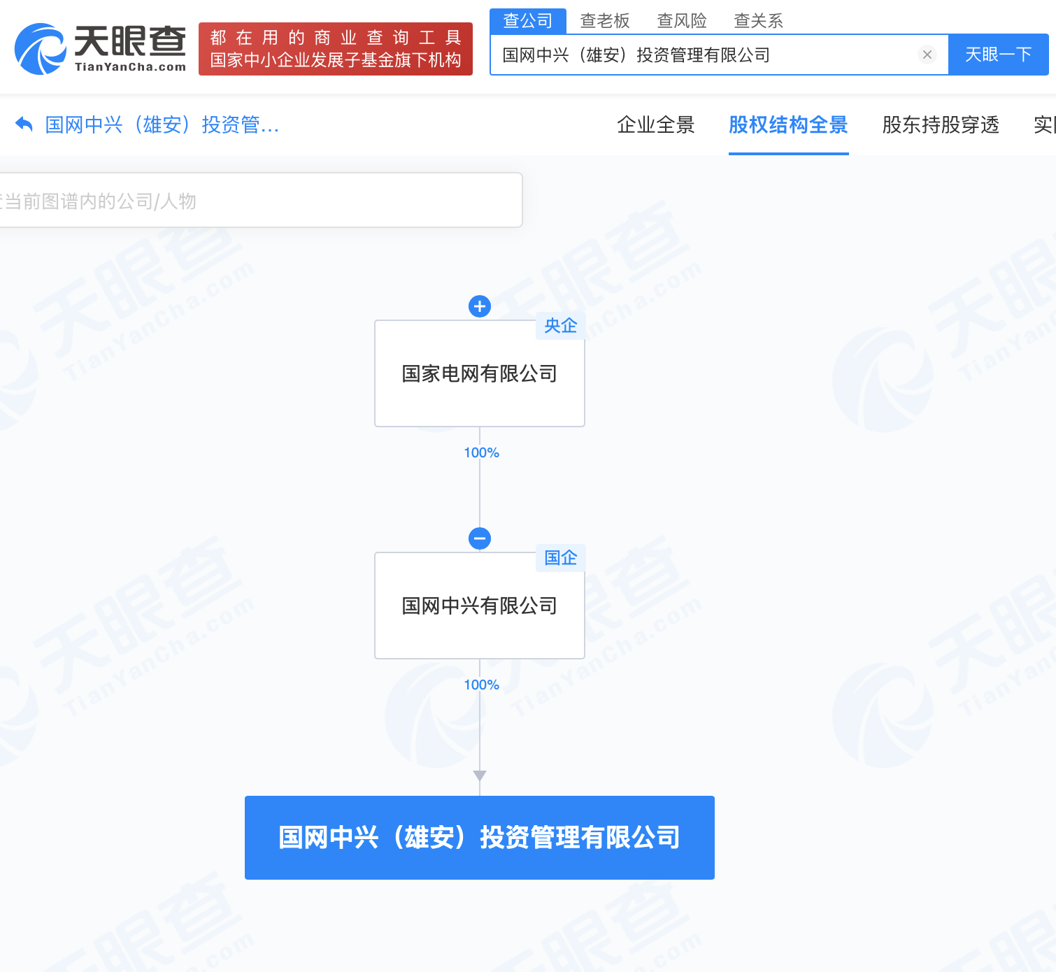 天眼查App显示,近日,国网中兴(雄安)投资管理有限公司成立,法定代表人为战礼勇,注册资本16.84亿人民币,经营范围包括自有资金投资的资产管理服务、物业管理、物业服务评估、住房租赁、酒店管理、企业管理咨询等。股权全景穿透图显示,该公司由国网中兴有限公司全资持股,后者为国家电网有限公司全资子公司。