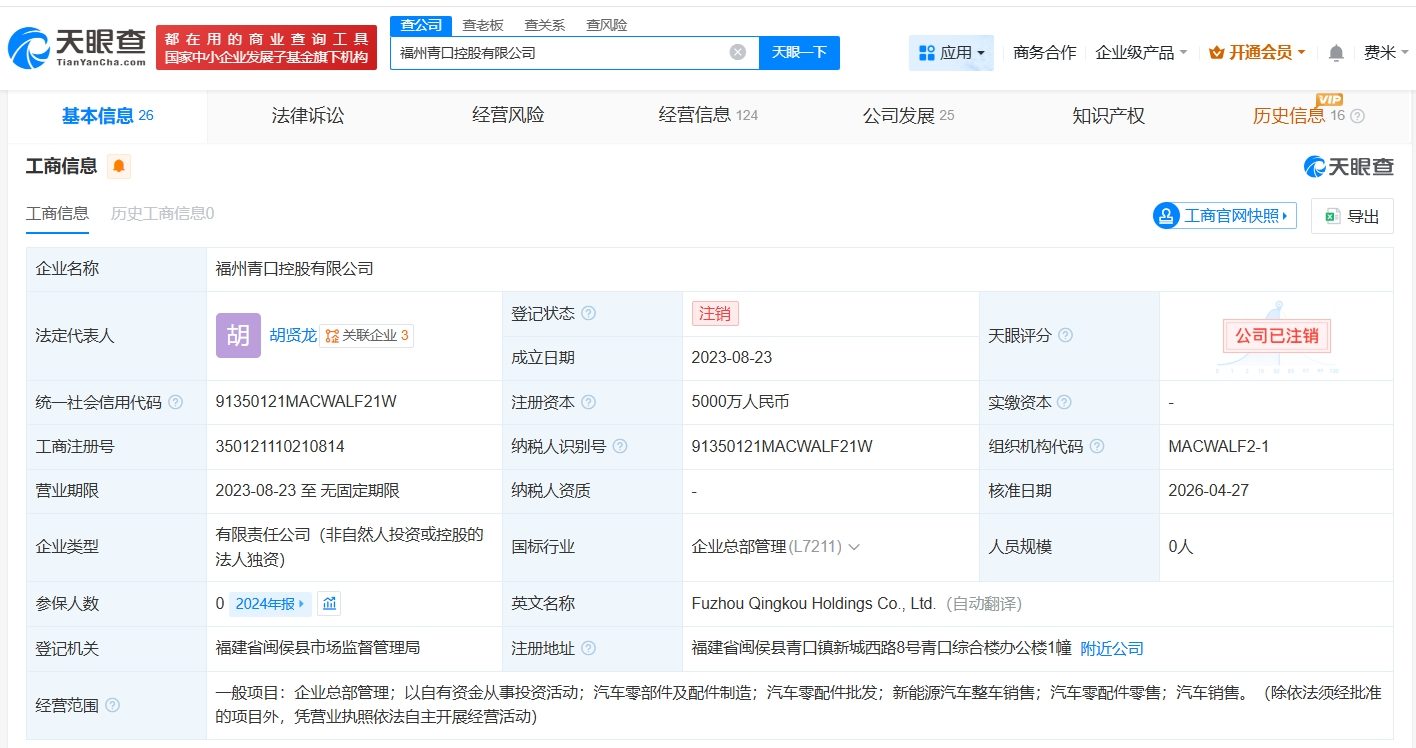 天眼查App显示,近日,福州青口控股有限公司登记状态由存续变更为注销。
