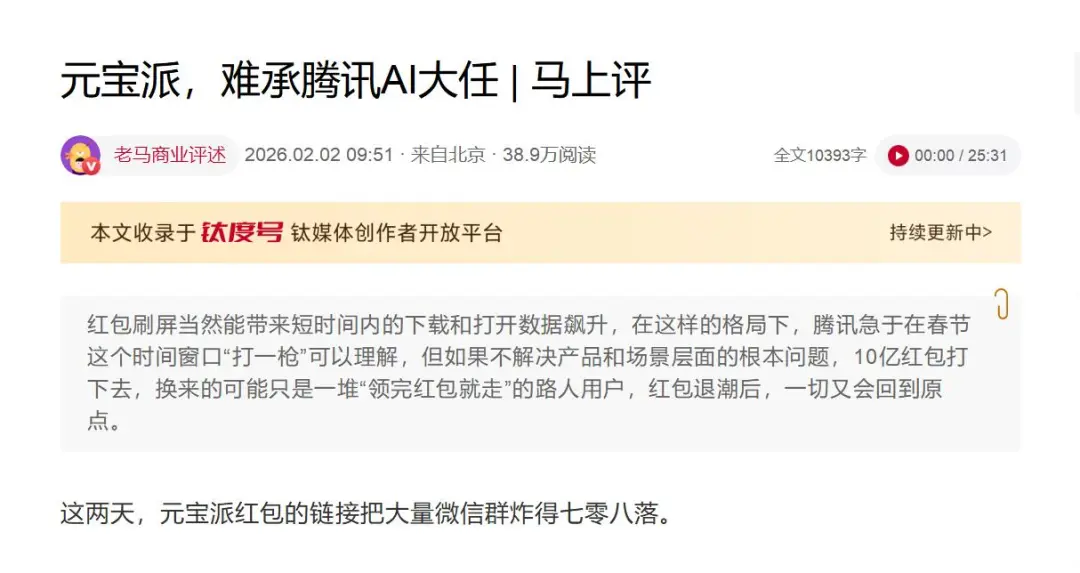 从营销声量看,元宝派确实打了一场漂亮的“闪电战”——10亿红包、马化腾亲自站台、微信社交裂变,这套组合拳在短期内把元宝派推到了聚光灯下。