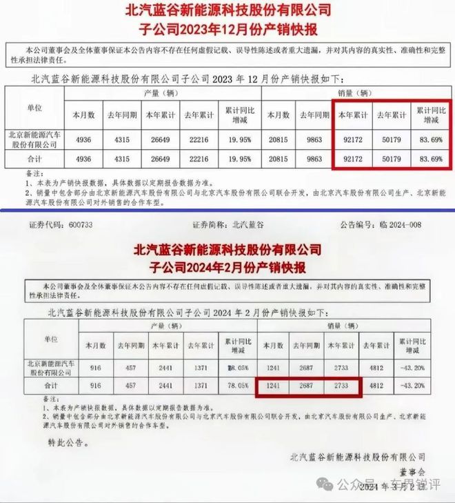 3月2日,北汽蓝谷发布2024年2月份产销快报,公司前两个月销量2733辆,同比下降43.2%。