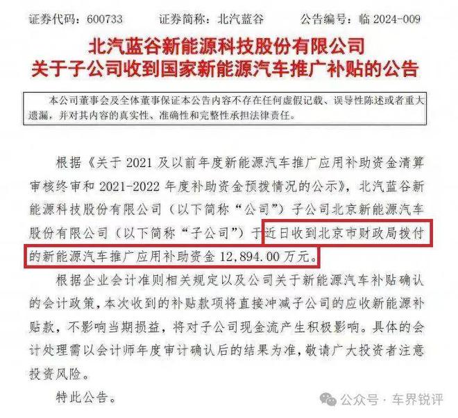 2024年3月2日,北汽蓝谷公告,公司子公司北京新能源近日获得新能源汽车推广应用补助资金1.29亿元。