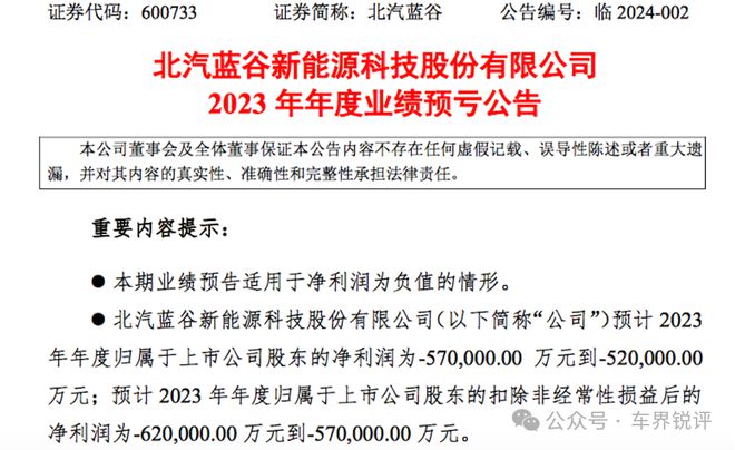根据北汽蓝谷最新发布的2023年业绩预告显示:预计2023年实现净利润为-52亿至-57亿元;扣非净利润为-57亿至-62亿元。