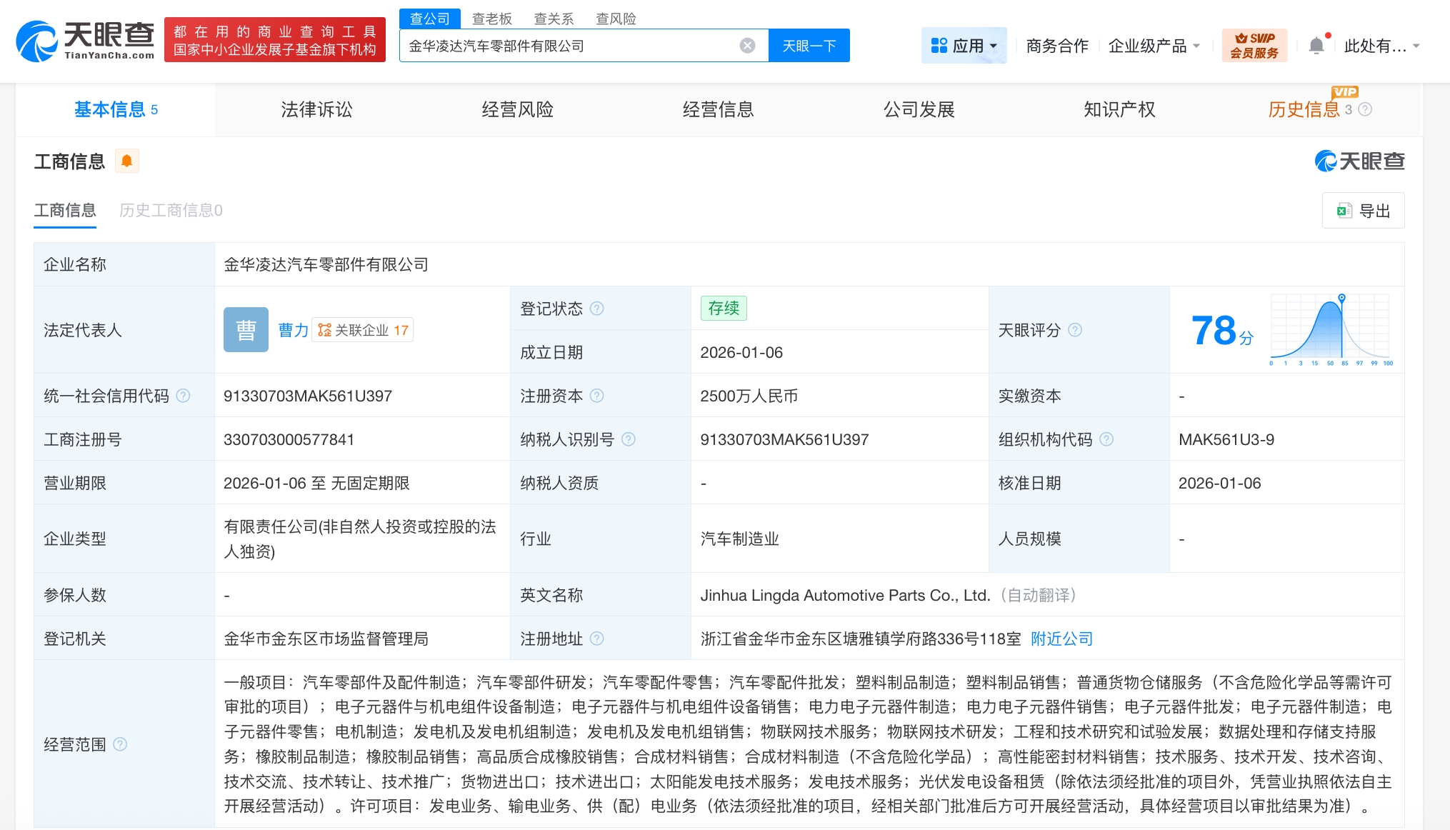 天眼查工商信息显示,近日,金华凌达汽车零部件有限公司成立,法定代表人为曹力,注册资本2500万人民币,经营范围含汽车零部件及配件制造、汽车零部件研发、汽车零配件零售、电子元器件与机电组件设备制造、电子元器件与机电组件设备销售、数据处理和存储支持服务、太阳能发电技术服务等。