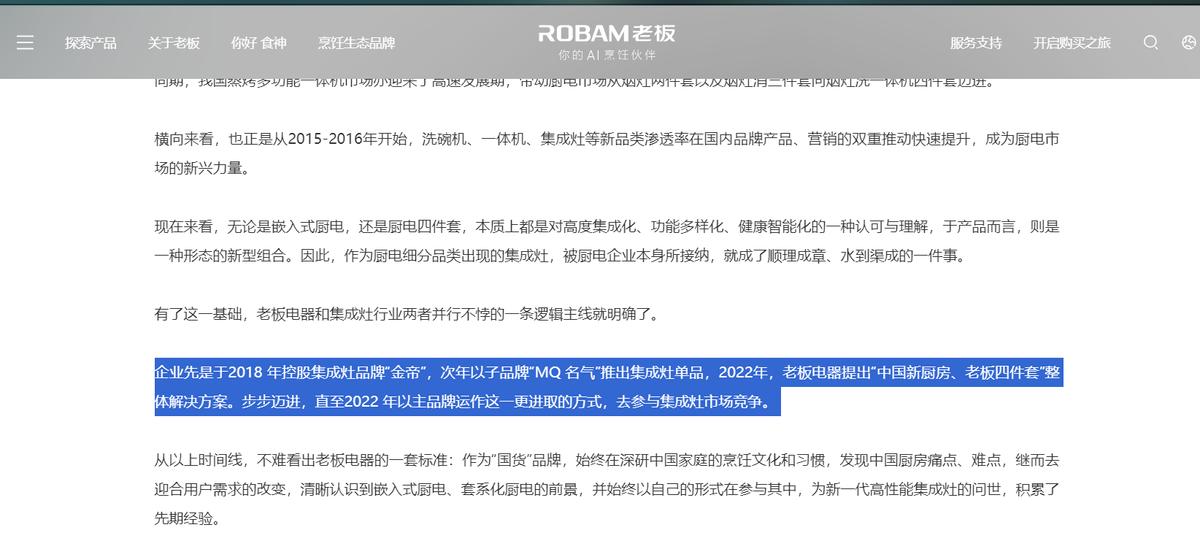 随后,在2022年,老板电器又打脸式地提出“中国新厨房、老板四件套”整体解决方案,由主品牌下场去参与集成灶市场竞争……