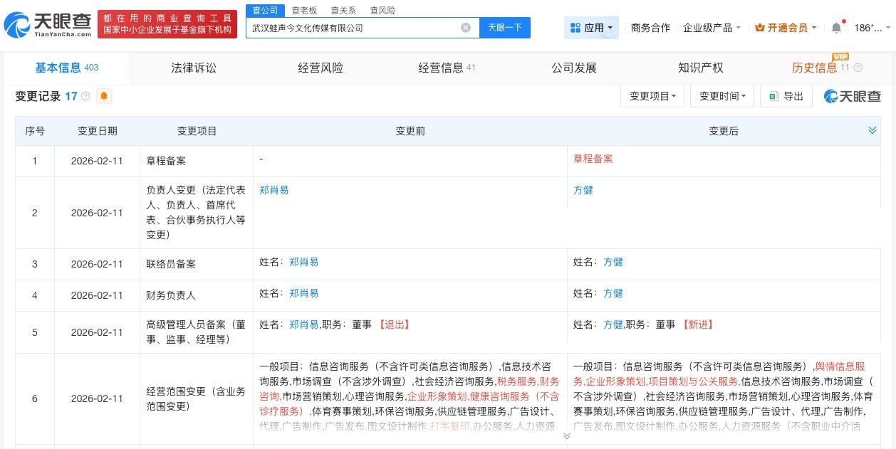 天眼查App显示,武汉蛙声今文化传媒有限公司成立于2022年7月,法定代表人为方健,注册资本100万人民币,经营范围包括舆情信息服务、个人互联网直播服务、互联网新闻信息服务、广播电视节目制作经营等。股东信息显示,该公司由郑肖易、湖北新艺企业管理有限公司共同持股。变更记录显示,2026年2月,该公司曾变更法定代表人、财务负责人、联络员等。此外,该公司2024年10月曾变更公司名称。