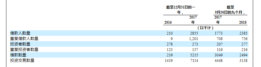 截止2018年9月30日,平台借款人数目为238.5万人,重复借款人数为75.6万人,投资者人数为27.7万人,重复投资者21.6万人。