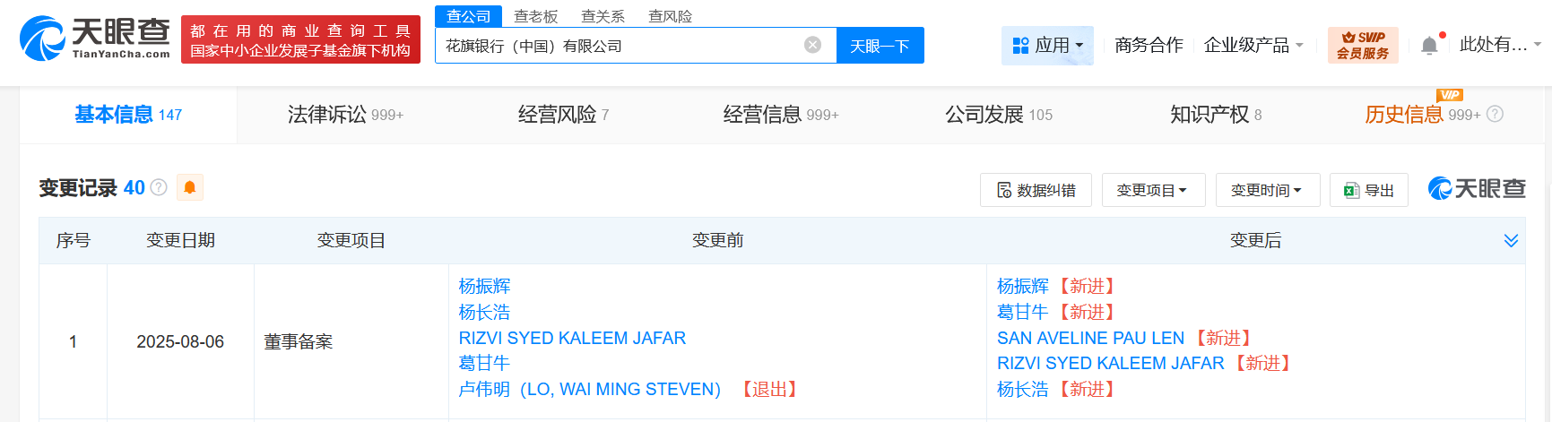 天眼查工商信息显示,近日,花旗银行(中国)有限公司发生工商变更,卢伟明(LO, WAI MING STEVEN)卸任董事长,由SAN AVELINE PAU LEN接任。今年7月,该公司发生高管变更,杨长浩卸任法定代表人、Nadir Sarela卸任董事,ZHANG WENJIE接任法定代表人、董事并担任经理。