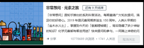 2018年,联合国教科文组织将2019年定为国际化学元素周期表年,以庆祝元素周期表诞生150周年。2019年3月6日,借此契机,知乎与中国科普博览联合推出「非常想问·元素之旅」线上科普活动,携手中科院化学所副研究员鲁闻生@biomimetic,日本大阪大学助理教授@张昊,上海大学副教授李永乐@Yongle Li,清华大学博士@孙亚飞等十多位科研工作者和名校博士,为网友带来可信赖的化学知识科普。