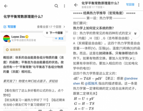 不只是此次「非常想问·元素之旅」活动,「化学」也是知乎讨论的热门领域之一,站内相关问答囊括了化学理论、前沿发展、化工化财、化学生命与安全、趣味化学知识等方方面面,产出了颇多高质量回答。在问题「化学平衡常数原理是什么?」下,法国里尔大学博士后邹路遥@ Luyao Zou从经典热力学推导的宏观角度,及动力学平衡的微观角度两方面佐证。