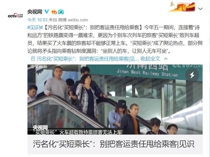今年五一期间,连接着“诗和远方”的铁路票变得一票难求,更因为个别车次列车的旅客“买短乘长”致列车超员,结果买了火车票的旅客却不能够正常上车。“买短乘长”成了舆论热点,部分舆论就将矛头指向乘客钻制度漏洞:“坐别人的车,让别人无车可坐”。