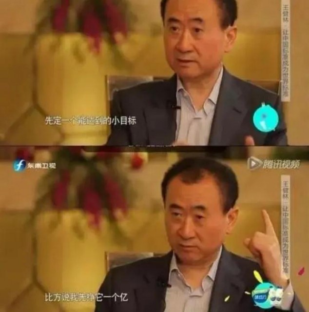 2014年,万达商业在香港成功上市;2015年,万达走向全球化,先后收购多个海外优质资产。2016年,王健林在接受鲁豫采访时说:“先定一个小目标,比如我先挣它一个亿……”