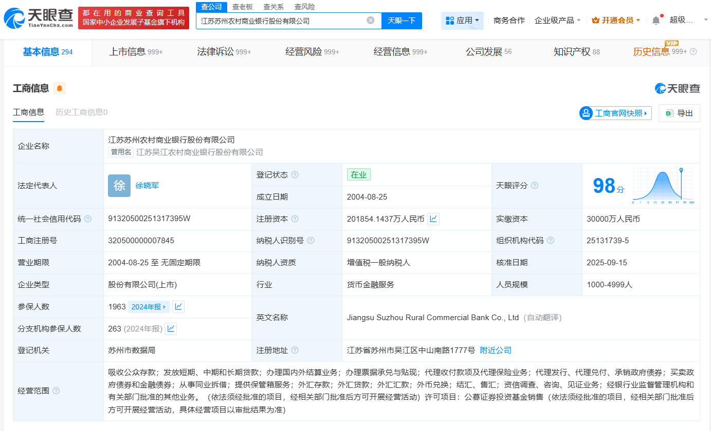 江苏苏州农村商业银行股份有限公司成立于2004年8月,法定代表人为徐晓军,经营范围包括吸收公众存款、办理国内外结算业务、办理票据承兑与贴现等。股东信息显示,该公司由亨通集团有限公司、江苏新恒通投资集团有限公司等共同持股。
