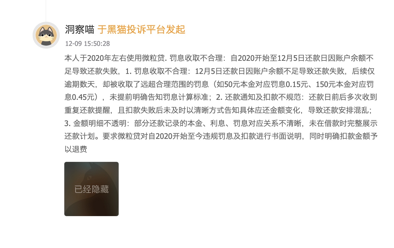 更深层的问题在于逾期之后的费用叠加。多名黑猫平台用户反映,当还款出现逾期,罚息、逾期管理费等费用开始滚动计入,但催收短信与电话中的欠款数字,往往只呈现一个不加分项说明的总额,借款人无法清晰核实本金、利息、罚息各占多少,面对催收压力时处于完全的信息弱势地位。这种“还款时才被动发现真实成本”的体验,是大量投诉情绪激化的直接诱因。