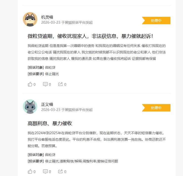 陈女士的遭遇并非孤例。截至本文发稿,黑猫投诉平台上含“微粒贷”关键词的累计投诉量已达64,491条。2026年3月22日,黑猫平台上仍有用户反映收到微粒贷委托专线催收电话,工号607***的催收员在通话中引导借款人“借新还旧”。与此同时,多名用户在平台上投诉微粒贷综合息费偏高、利率披露不透明,认为隐性费用加重了还款负担,进一步激化了借贷双方的矛盾。
