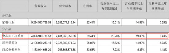 相比于2018年41.73%的占比,九阳在食品加工机系列上所占的比重进一步被拉大,同比增减幅度为20.2%,也就是说以豆浆机为主的产品在集团内的地位进一步强化了。