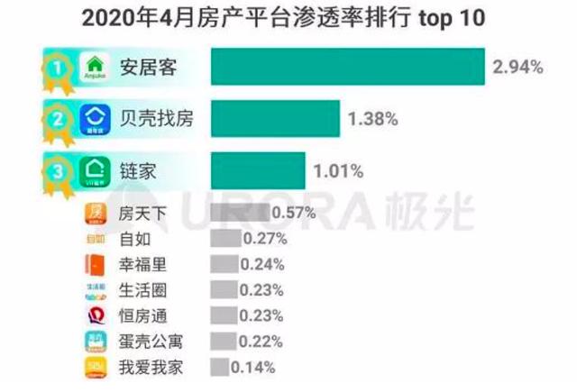 根据极光数据显示,2020年4月房产平台app渗透率排行榜58旗下安居客排名第一,贝壳、链家、自如这些贝壳系的品牌都在安居客之后。