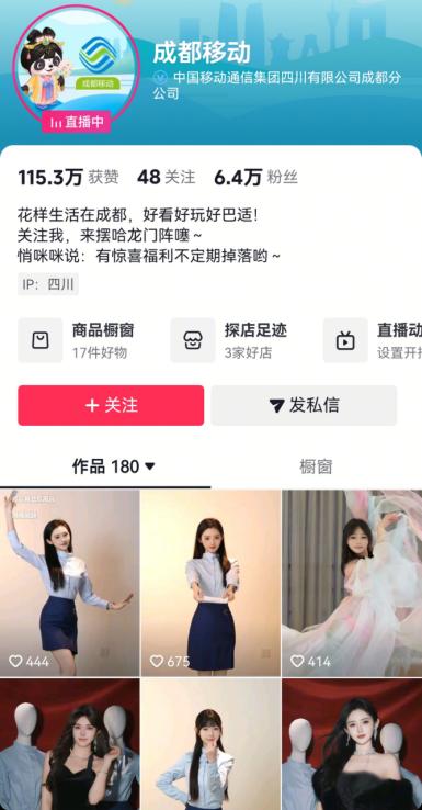 2月9日下午,记者在抖音平台搜索“成都移动”发现,该账号正在直播,观看人数不足十人,主播仍在积极回应评论区提问。翻看其主页可见,自2024年3月31日起,账号开始密集推送年轻女员工跳舞视频,至今已累计发布约180条。