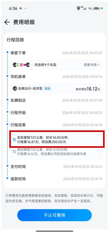 广东的消费者王先生(化名)则在如祺出行用车后被要求支付高达200元的附加费。记者从王先生提供的订单截图可以看到,其乘坐如祺出行经济型车辆,实际里程7.01公里,时长14分钟,行程费16.87元,附加费却高达200元。