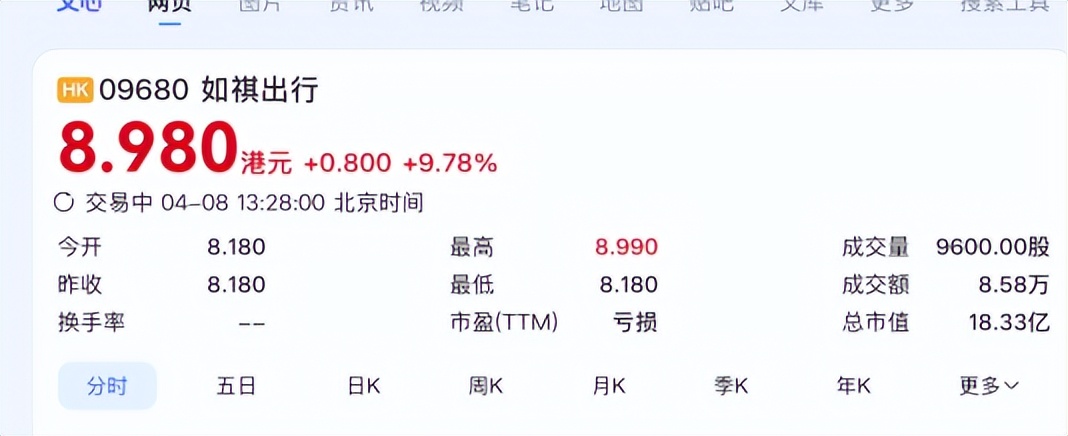 此外,资本市场对如祺出行的发展前景也持谨慎态度。有媒体报道2024年7月如祺出行以35港元/股的发行价登陆港交所,上市首日便遭遇破发,股价一度下跌超 10%;截至 2026年4月8日13:28,其股价已跌至8.98港元,较发行价跌去 73.8%,市值大幅缩水,反映出投资者对公司业务发展质量、盈利可持续性的信心不足。
