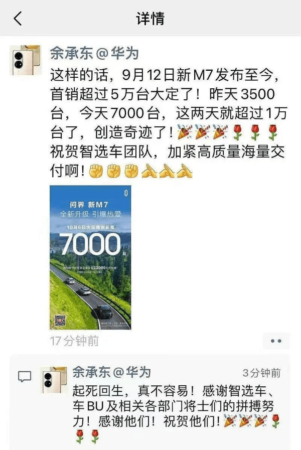 余承东也是高兴的不行,直接在朋友圈发文,宣布问界起死回生。
