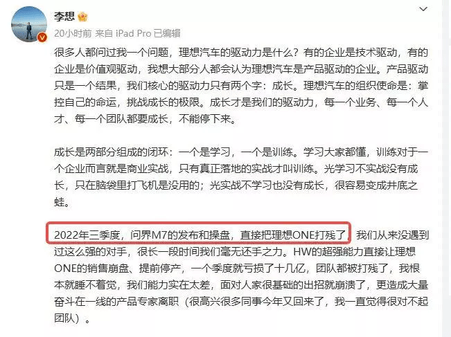 之前,李想就在小作文里写过:2022 年三季度,问界 M7 的发布和操盘,直接把理想 ONE 打残了。