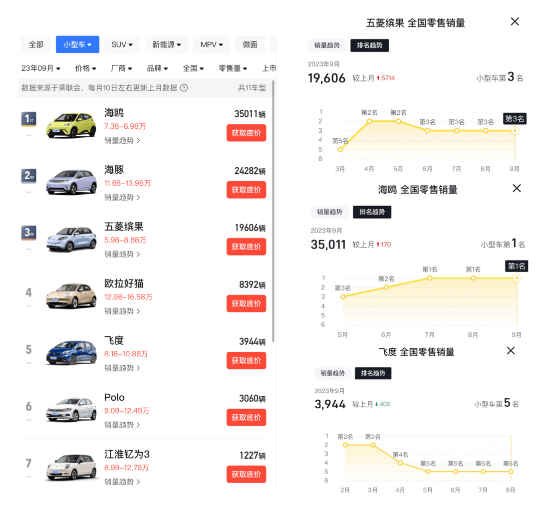 举个例子说说,在 10 万元以下的小型车市场,比亚迪有海鸥,五菱那边推了缤果,这俩无论是价格还是尺寸都很相似(海豚售价比这俩高一个档次,就不做讨论 ),参数、配置上也是不分伯仲。