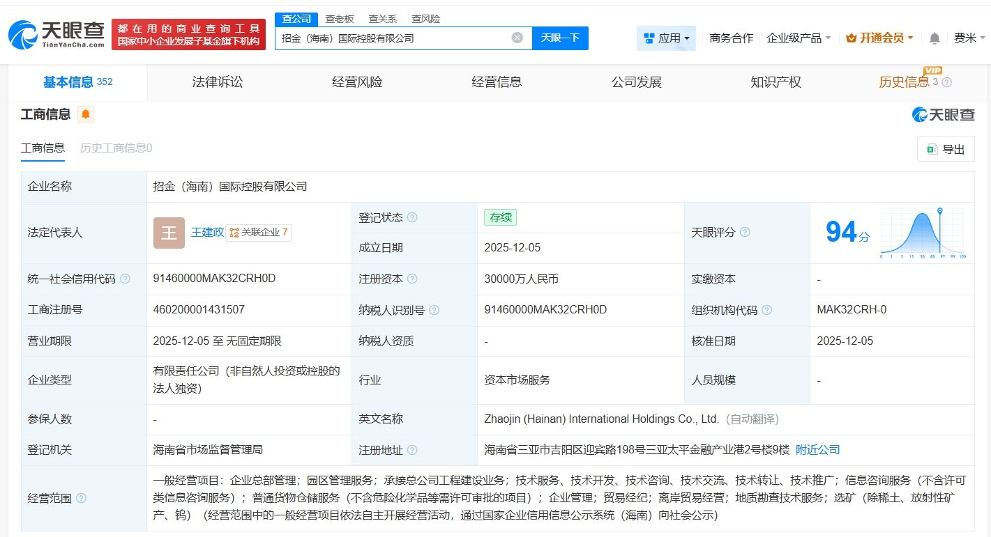 近日,招金(海南)国际控股有限公司成立,法定代表人为王建政,注册资本3亿人民币,经营范围包括企业总部管理、园区管理服务、承接总公司工程建设业务等,由招金矿业(01818.HK)全资持股。