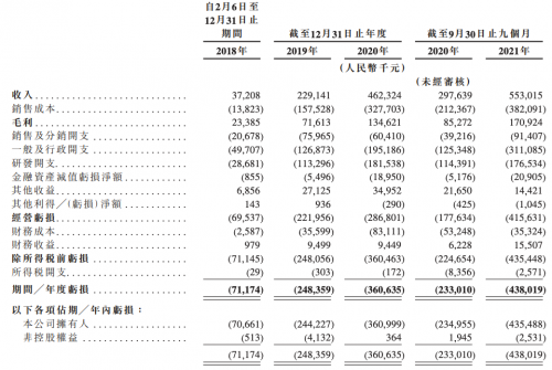 财务方面,2018年、2019年、2020年全年及2021年首9个月,创新奇智收入分别是人民币3720万元、2.29亿元、4.62亿元及5.53亿元;同期内的亏损净额分别为7117万元、2.48亿元、3.61亿元、4.38亿元。