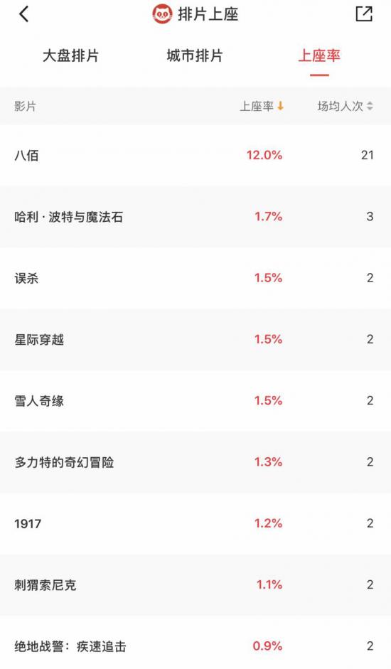 就目前来说,整体的观影人群是偏向于谨慎的。从下图猫眼娱乐专业版的上座排名明显看出,仅《八佰》的上座率超过了两位数,哈利波特影迷们心中的“白月光”《哈利波特与魔法石》的上座率仅1.7%。