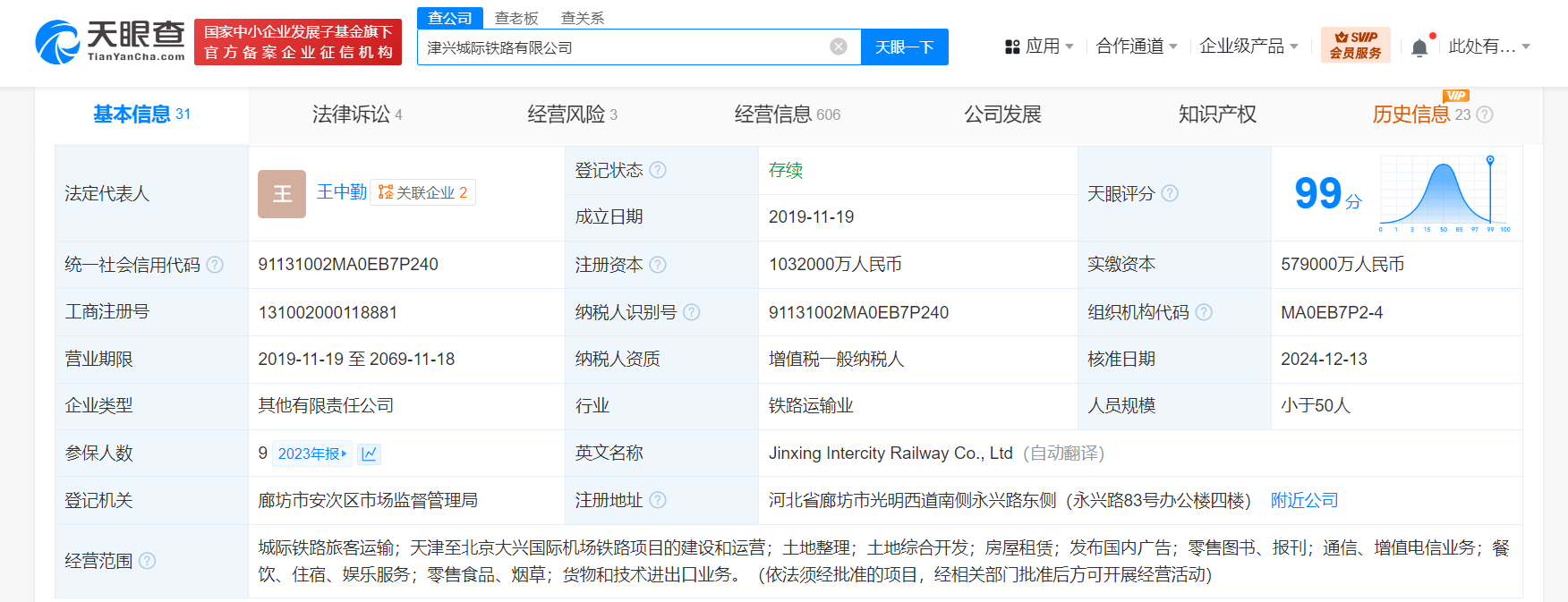 津兴城际铁路有限公司成立于2019年11月,经营范围为城际铁路旅客运输、天津至北京大兴国际机场铁路项目的建设和运营等。公开信息显示,津兴城际铁路是河北廊坊一条连接胜芳站与固安东站的城际铁路,与津保铁路天津西至胜芳段、京雄城际铁路固安东至大兴机场段共同构成天津西至大兴机场的通道。2023年12月18日,津兴城际铁路开通运营。