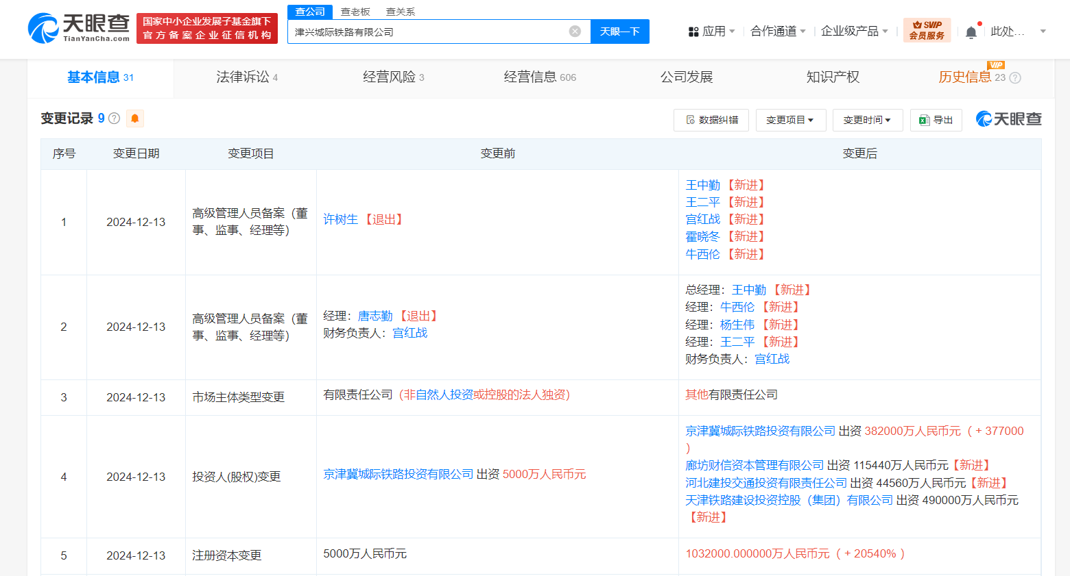 天眼查App显示,近日,津兴城际铁路有限公司发生工商变更,新增天津铁路建设投资控股(集团)有限公司、廊坊财信资本管理有限公司、河北建投交通投资有限责任公司为股东;许树生卸任法定代表人、执行董事,由王中勤任法定代表人、总经理、董事,宫红战任董事长,其余多位主要人员均发生变更;同时,该公司注册资本由5000万人民币增至103.2亿人民币,增幅20540%。