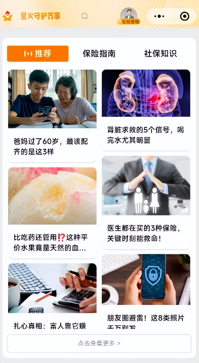 今年3月中旬,记者打开“星火保”微信小程序”首页“中”推荐“中显示《爸妈过了60岁,最该配齐的是这3样》《️肾脏求救的5个信号,喝完水尤其明显》《比吃药还管用 这种平价水果竟是天然的血糖稳定剂》《医生都在买的3种保险,关键时刻能救命!》《扎心真相:富人靠它赚钱,穷人嫌它骗钱!》等多篇文章,涉嫌引诱消费者的行为。