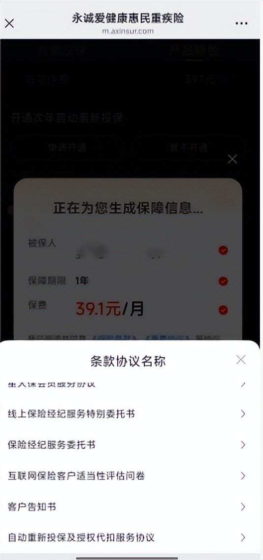 点击确认后进入投保页面,页面显示缴费计划为每期缴费39.1元,同时出现“开通次年自动重新投保”选项,提供“申请开通”与“暂不开通”两个选择按钮,页面提示开通前需仔细阅读《自动重新投保及授权代扣服务协议》,选择申请开通即视为同意该协议。