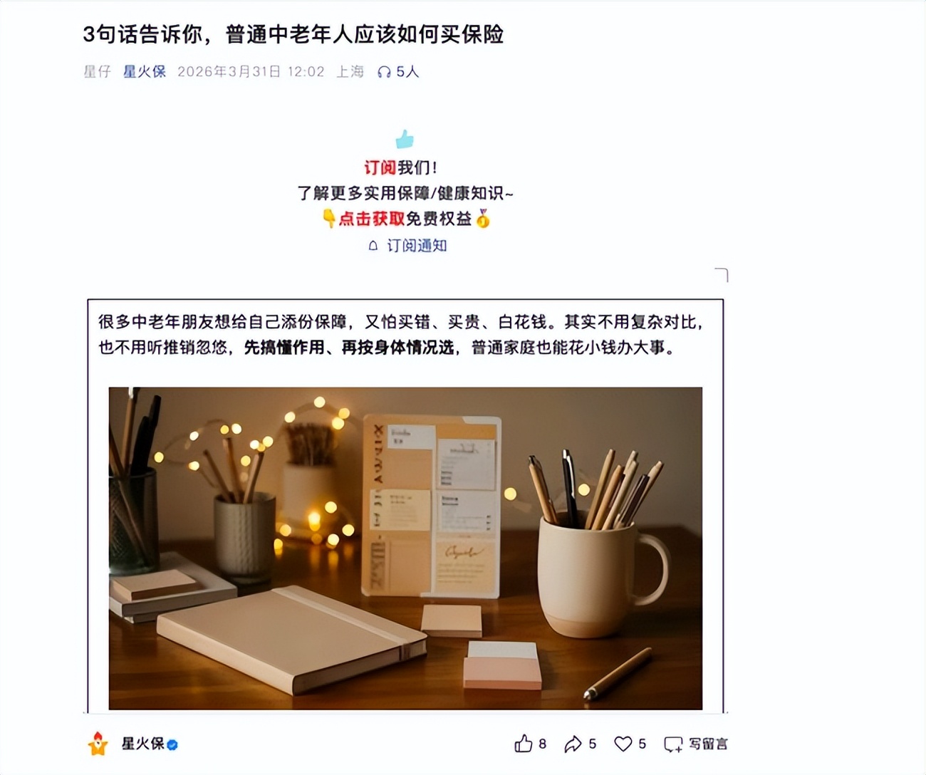 然而,大量误导老人的星火保,却在3月31日推出官方文章《3句话告诉你,普通中老年人应该如何买保险》,指导中老年人买保险,称核心就是先保基础、再补短板,不盲目跟风,选适合自己身体和预算的就对了。“星火保,专为中老年群体定制高适配保险方案,省心选险不踩坑。”