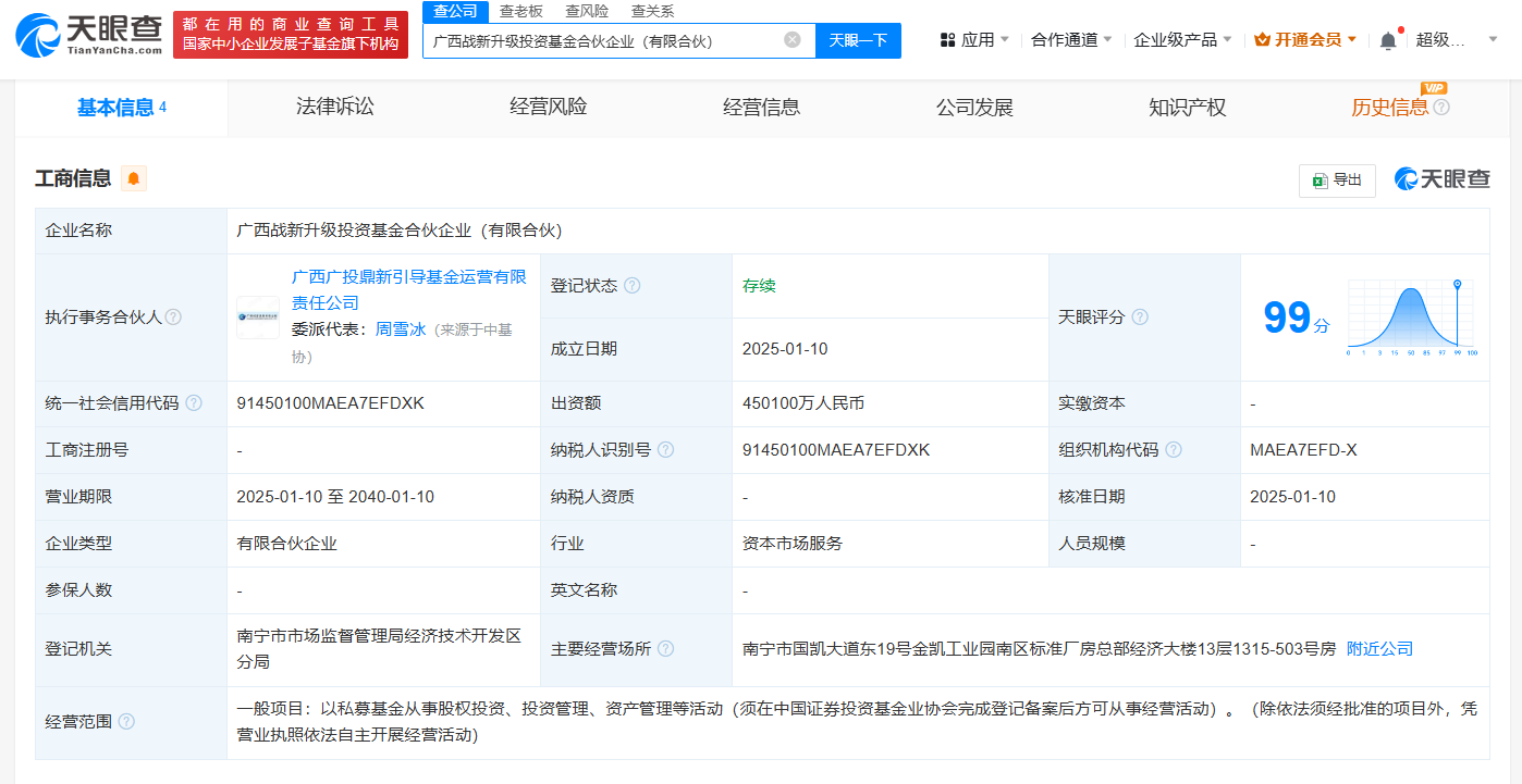 天眼查App显示,近日,广西战新升级投资基金合伙企业(有限合伙)成立,执行事务合伙人为广西广投鼎新引导基金运营有限责任公司,出资额45.01亿人民币,经营范围包括以私募基金从事股权投资、投资管理、资产管理等活动。合伙人信息显示,该基金由广投资本管理集团有限公司、广西投资引导基金有限责任公司、广西广投鼎新引导基金运营有限责任公司共同出资。