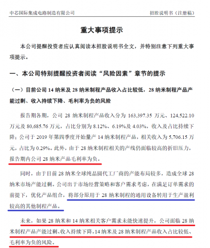 在招股书上有这样一些描述比较引人注意,“报告期内公司28纳米产品毛利率为负”以及“未来,如果28纳米和14纳米相关客户需求未能快速提升,公司面临28纳米制程产品产能过剩、收入持续下降,14纳米及28纳米制程产品收入占比较低、毛利率为负的风险。”