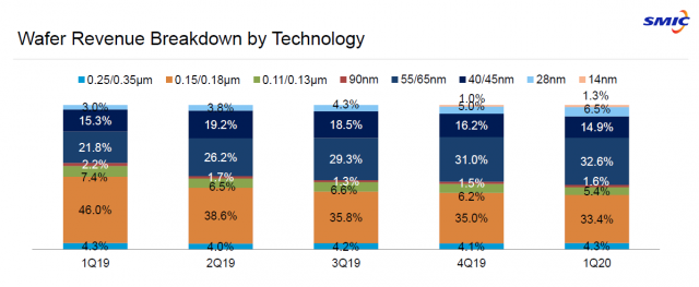 从报表上我们不难看出,为中芯国际收入提供较大贡献的是0.15/0.18微米工艺、55/56纳米工艺、40/45纳米工艺。虽然这不是最终的利润,但由此也能大概判断出中芯国际客户的需求结构。值得注意的是,中芯国际最先进的14纳米工艺即使在2020年第一季度也仅占1.3%,第二先进的28纳米工艺也仅占6.5%。这说明市场对于成熟工艺的需求量还是相当大的,成熟工艺虽然技术上略显落后,但仍有相当的盈利能力。