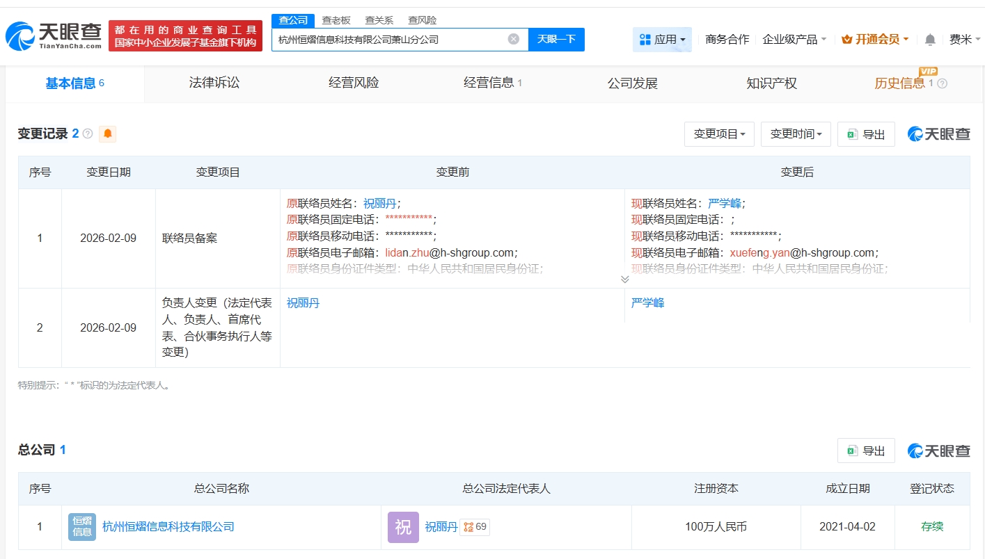 天眼查App显示,近日,杭州恒熠信息科技有限公司发生工商变更,祝丽丹卸任法定代表人、经理,由严学峰接任。此外,祝丽丹还卸任了杭州恒熠信息科技有限公司萧山分公司的负责人,由严学峰接任。