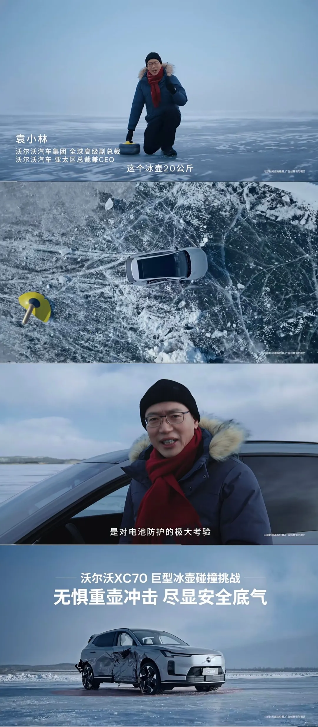 所以别说年近六旬的袁小林总了,无论是之前的XC60叠罗汉营销秀,还是此番XC70冰壶碰撞秀,换做是三十多岁的乐逗同学,不要一分钱我都敢和愿意,代替袁总出镜露脸。