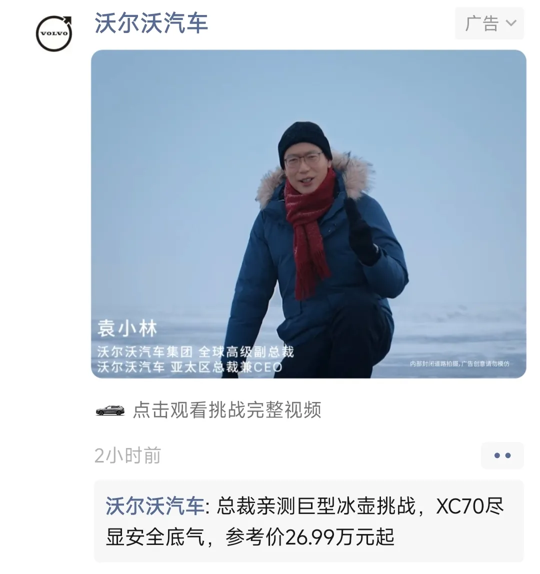 袁小林出镜沃尔沃XC70冰湖营销秀