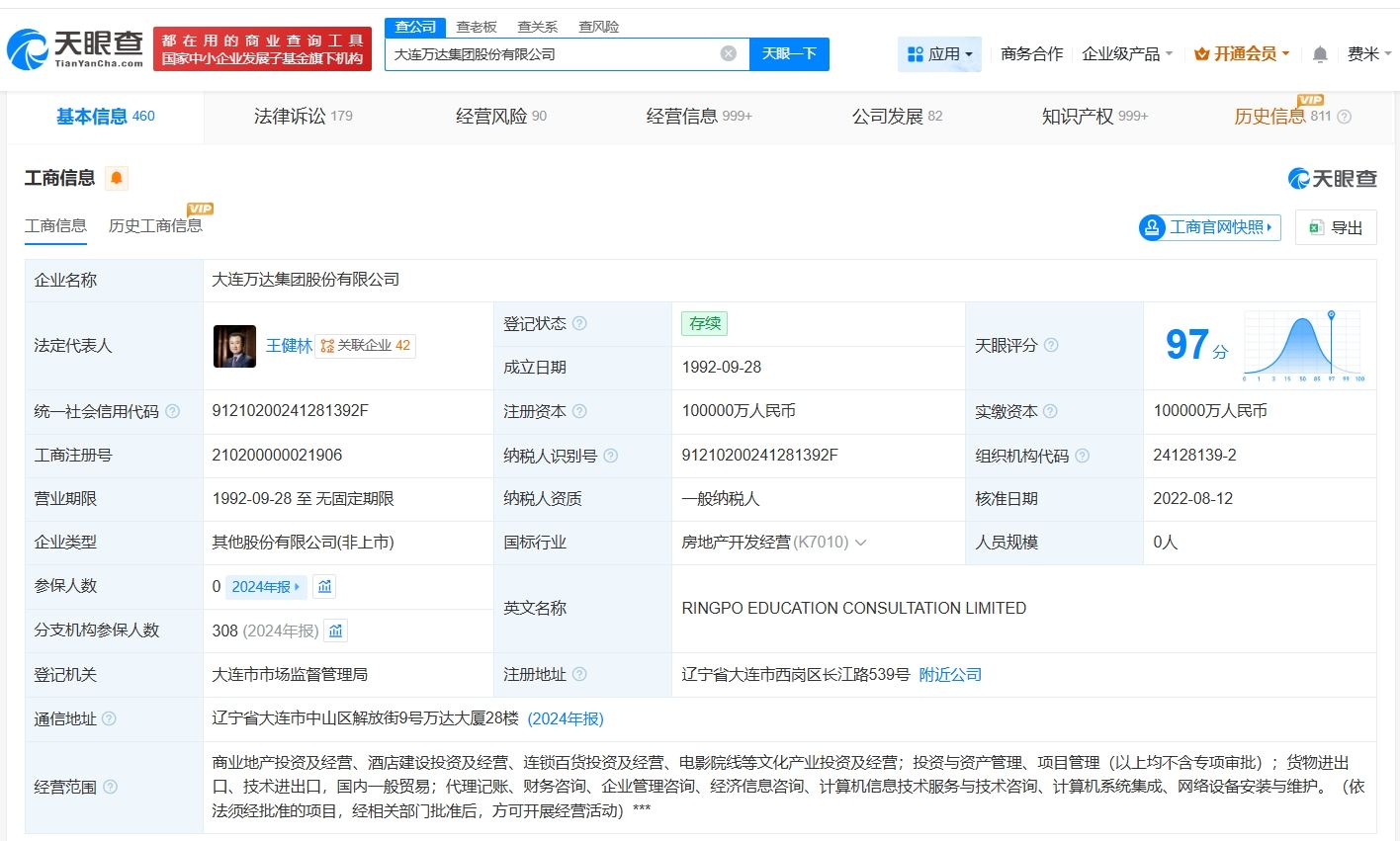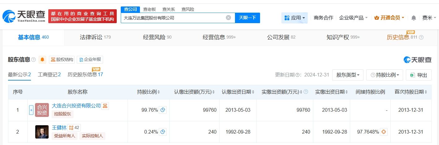 大连万达集团股份有限公司成立于1992年9月,法定代表人为王健林,注册资本10亿人民币,经营范围包括商业地产投资及经营、酒店建设投资及经营、连锁百货投资及经营、电影院线等文化产业投资及经营等。股东信息显示,该公司由大连合兴投资有限公司、王健林共同持股。天眼风险信息显示,该公司现存10条被执行人信息,被执行总金额超62亿元。