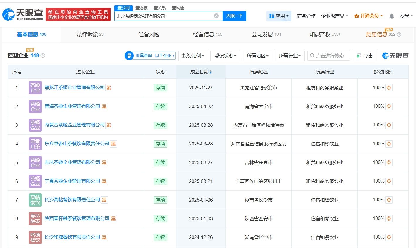 霸王茶姬实控百余家企业 霸王茶姬一年内成立多家新公司观点