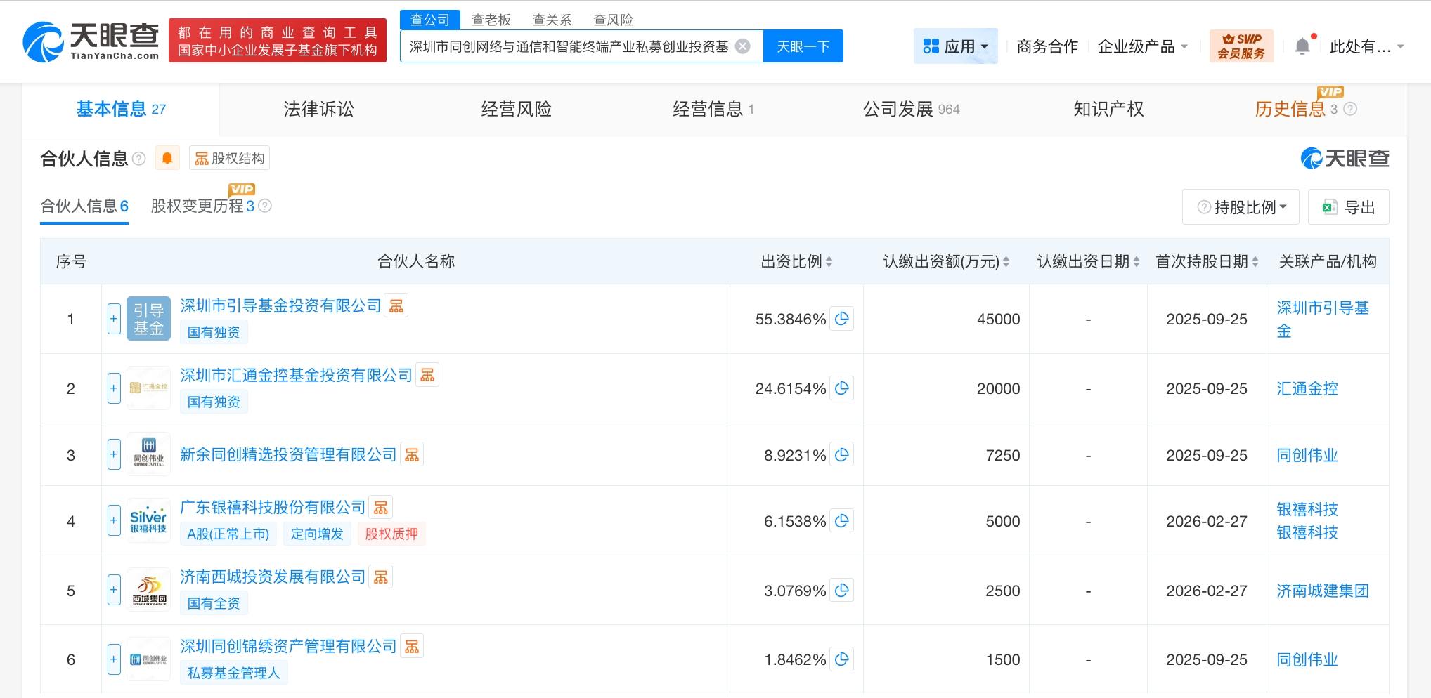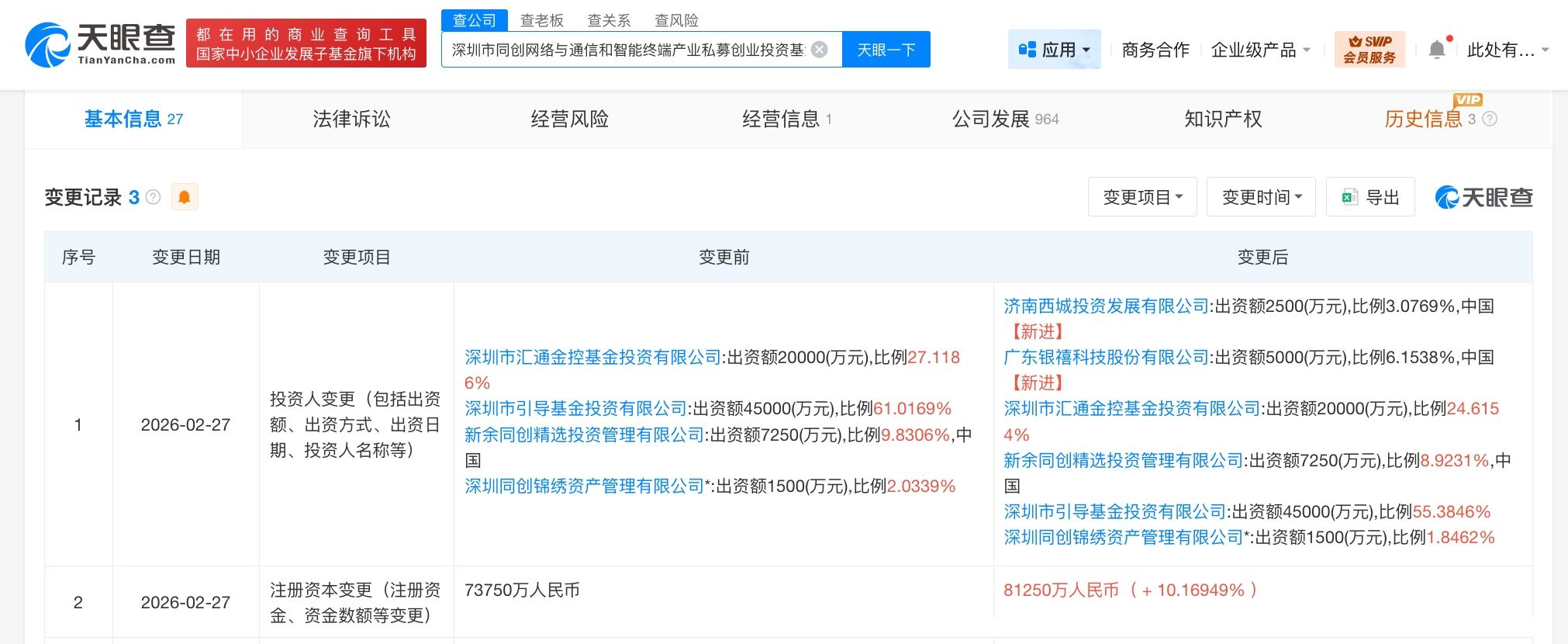 天眼查工商信息显示,近日,深圳市同创网络与通信和智能终端产业私募创业投资基金合伙企业(有限合伙)发生工商变更,新增银禧科技(300221)、济南西城投资发展有限公司为合伙人,同时,出资额由约7.4亿人民币增至约8.1亿人民币,增幅约10%。