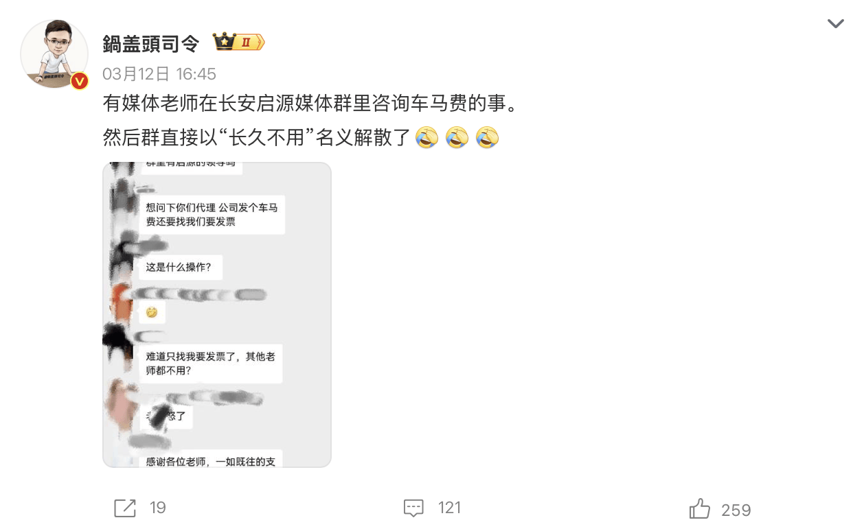博主在长安启源媒体群讨要车马费:代理公司要求开发票,群组突遭解散快讯